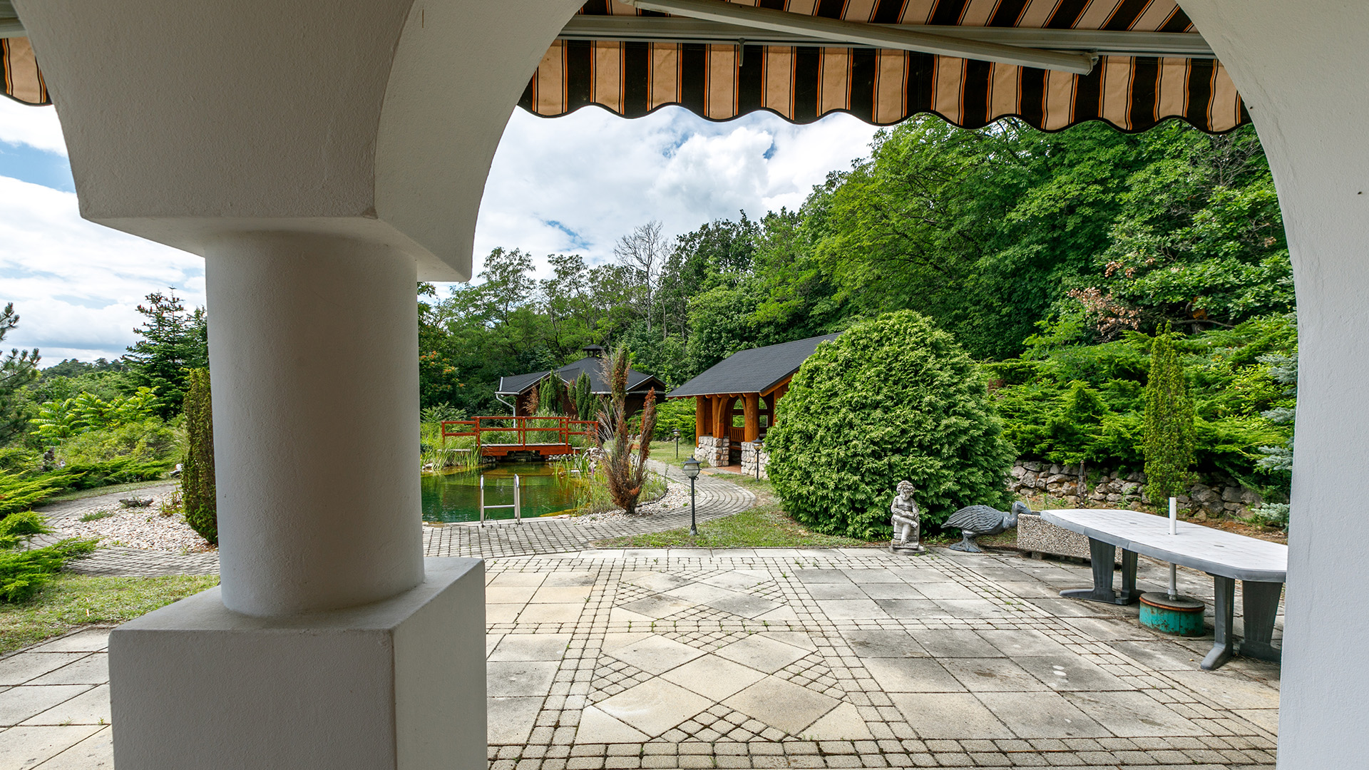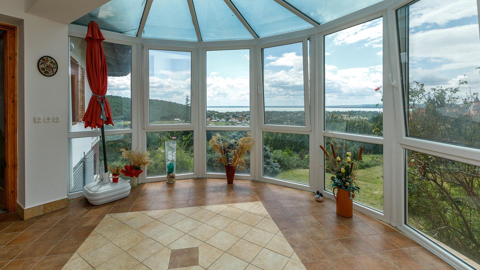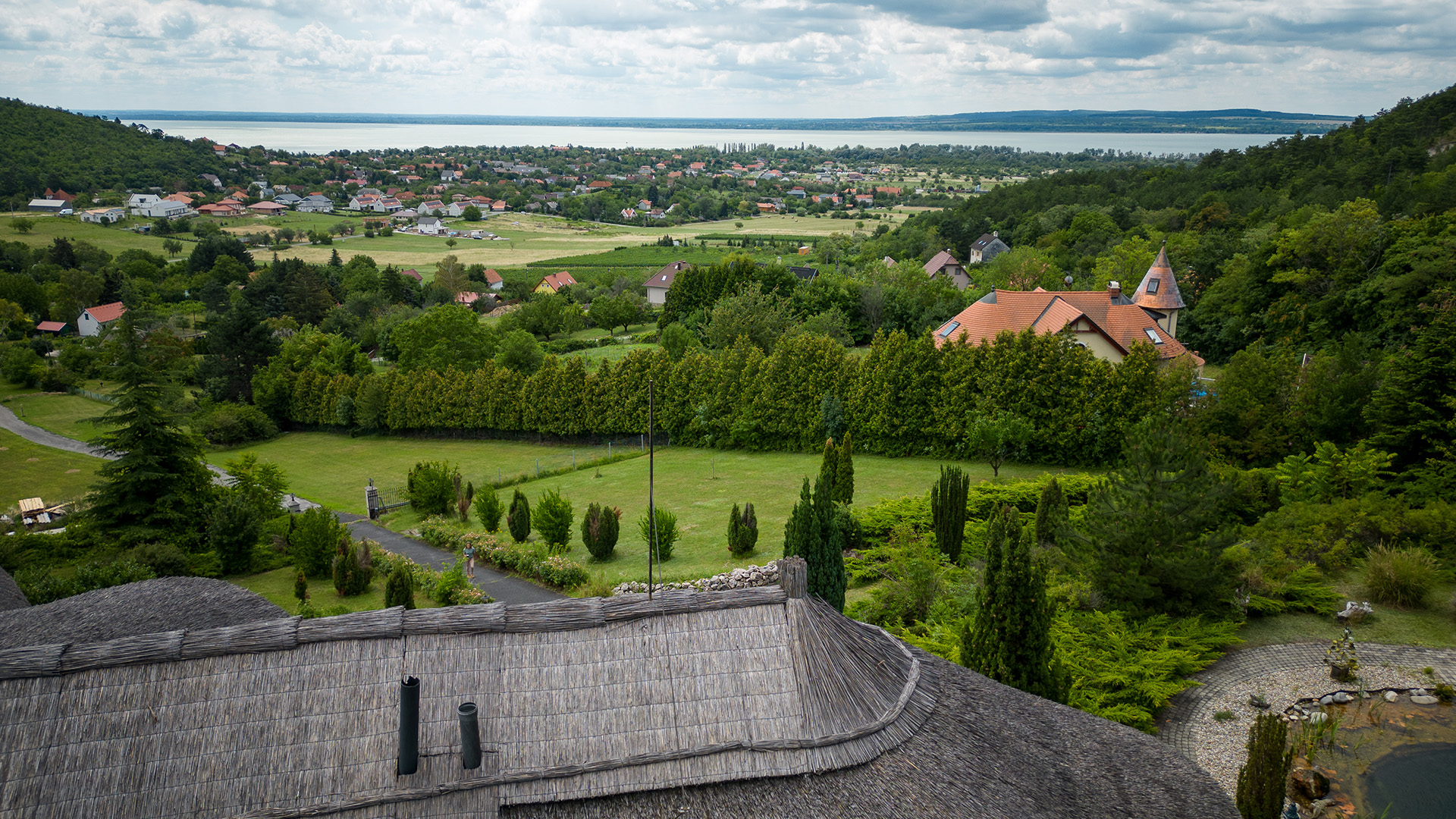 Diese besondere Reetdach-Immobilie liegt auf einem ca. 8827 m² großen Grundstück in Balatongyörök in wunderschöner, ruhiger Aussichtslage mit unverbaubarem Panoramablick auf den Plattensee. Die großzügige Wohnfläche von ca. 300 m² verfügt über einen Wohnbereich, vier Schlafzimmer, drei Bäder, ein Küche, ein Wintergarten, verschiedene Hauswirtschafts-/Nebenräume und einen Wellnessbereich mit Jacuzzi und Sauna. Der Garten ist wunderschön angelegt mit einem Schwimmteich, überdachtem großen Sitzplatz, Grill und einem Gartenhaus. Eine große Doppelgarage ergänzt dieses Angebot.