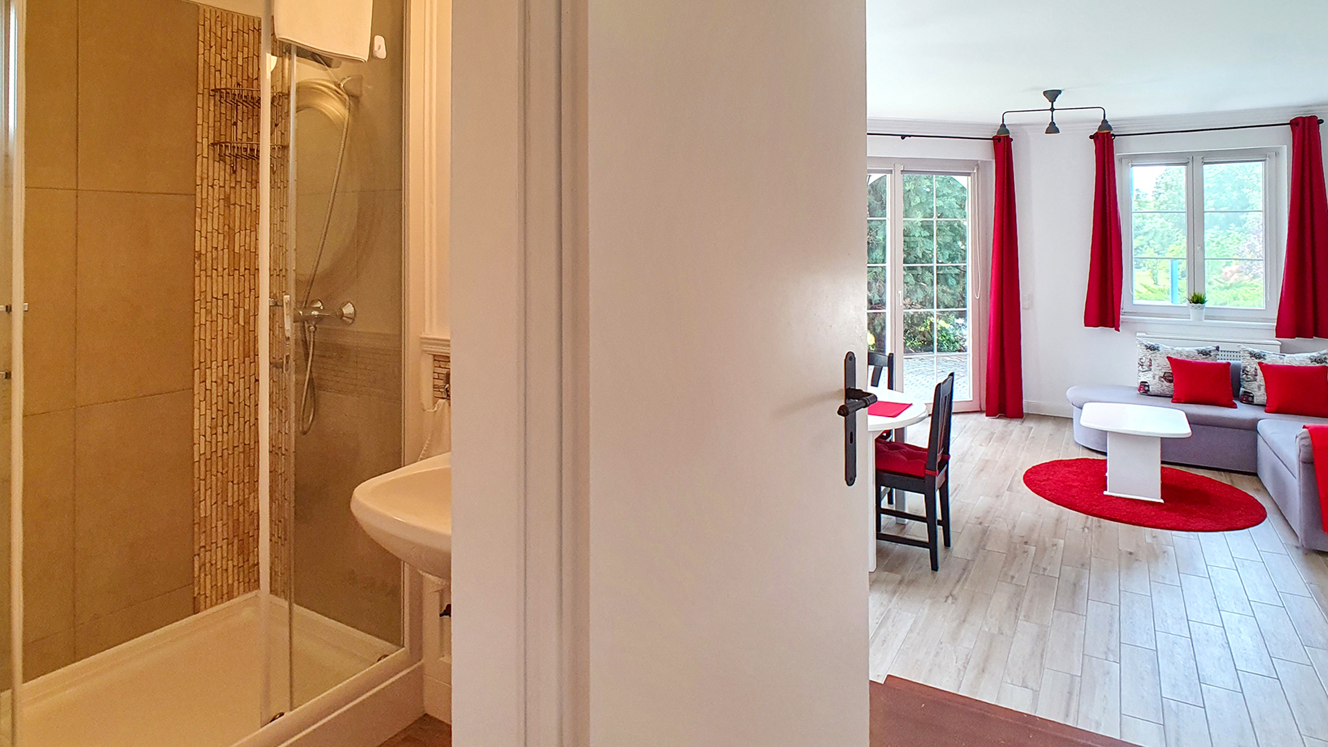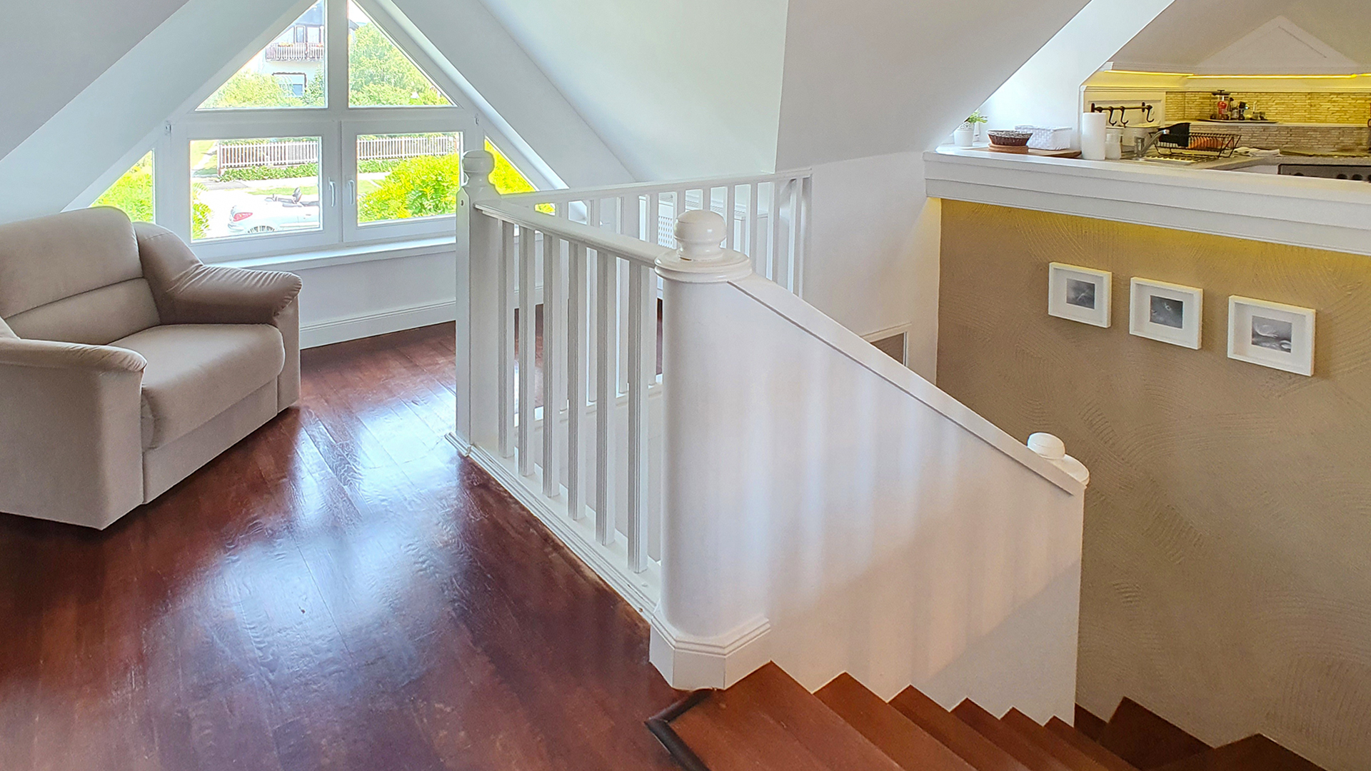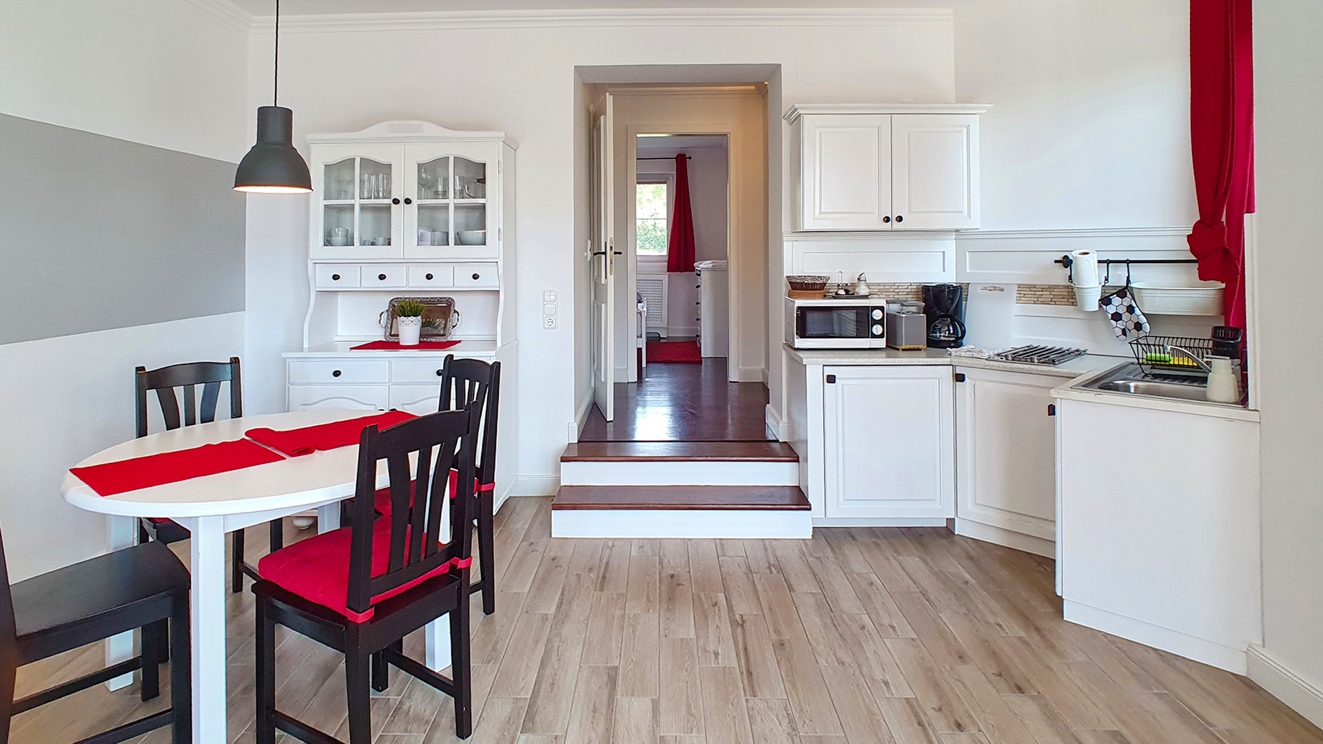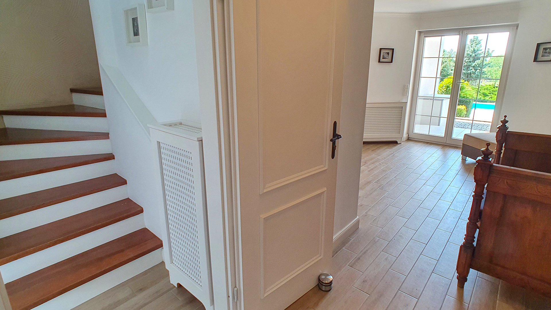 Einkaufsmöglichkeiten, Sprechzimmer, Schule sind alle in der Nähe; trotzdem befindet sich das Haus in einer ruhigen Gegend. Die Immobilie kann in 3 Wohnungen separiert werden: im Erdgeschoss wurden 2 Wohnungen und in der ersten Etage ebenfalls eine anspruchsvolle Wohnung ausgestattet.