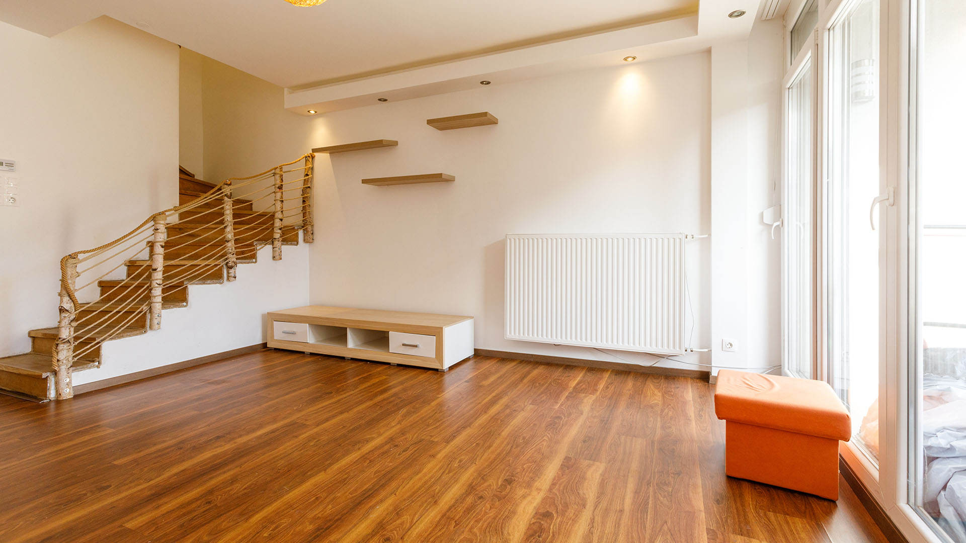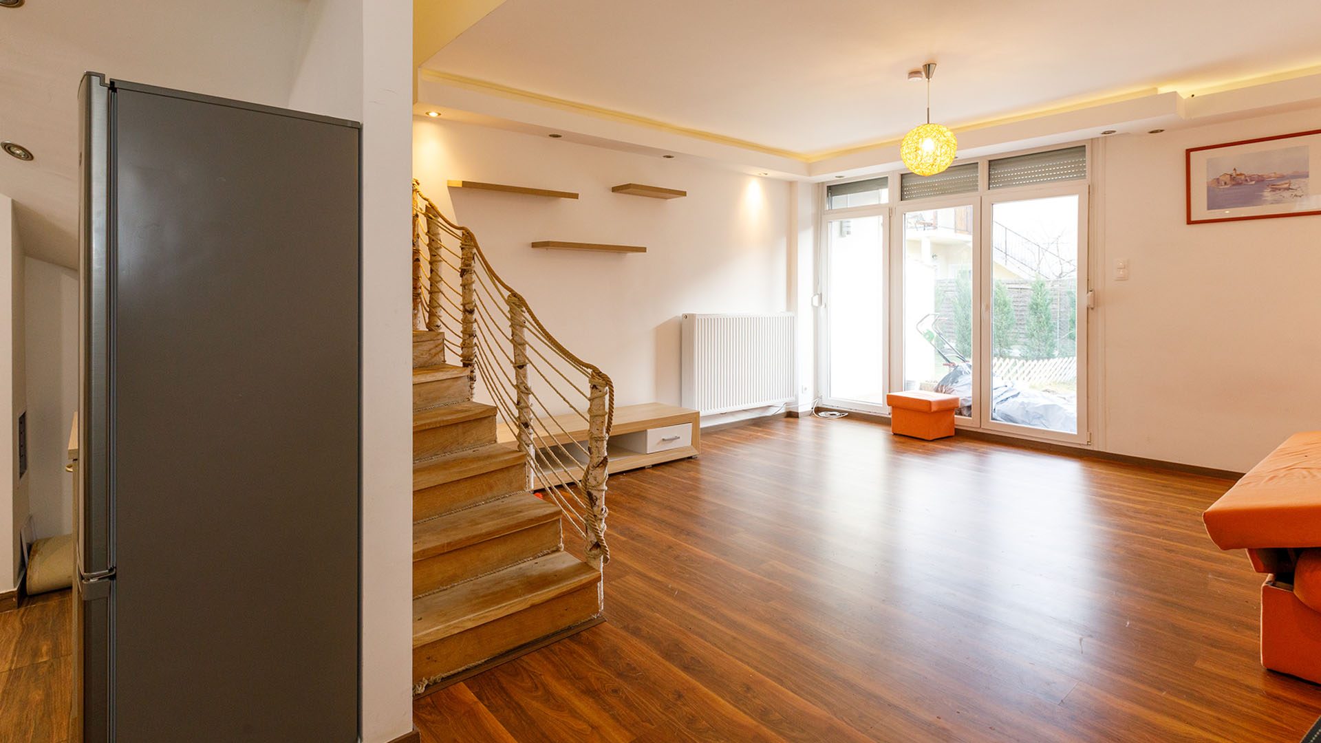 - Im Erdgeschoss befindet sich das Wohnzimmer mit amerikanischer Küche, ein Vorraum und eine Terrasse mit Gartenzugang.